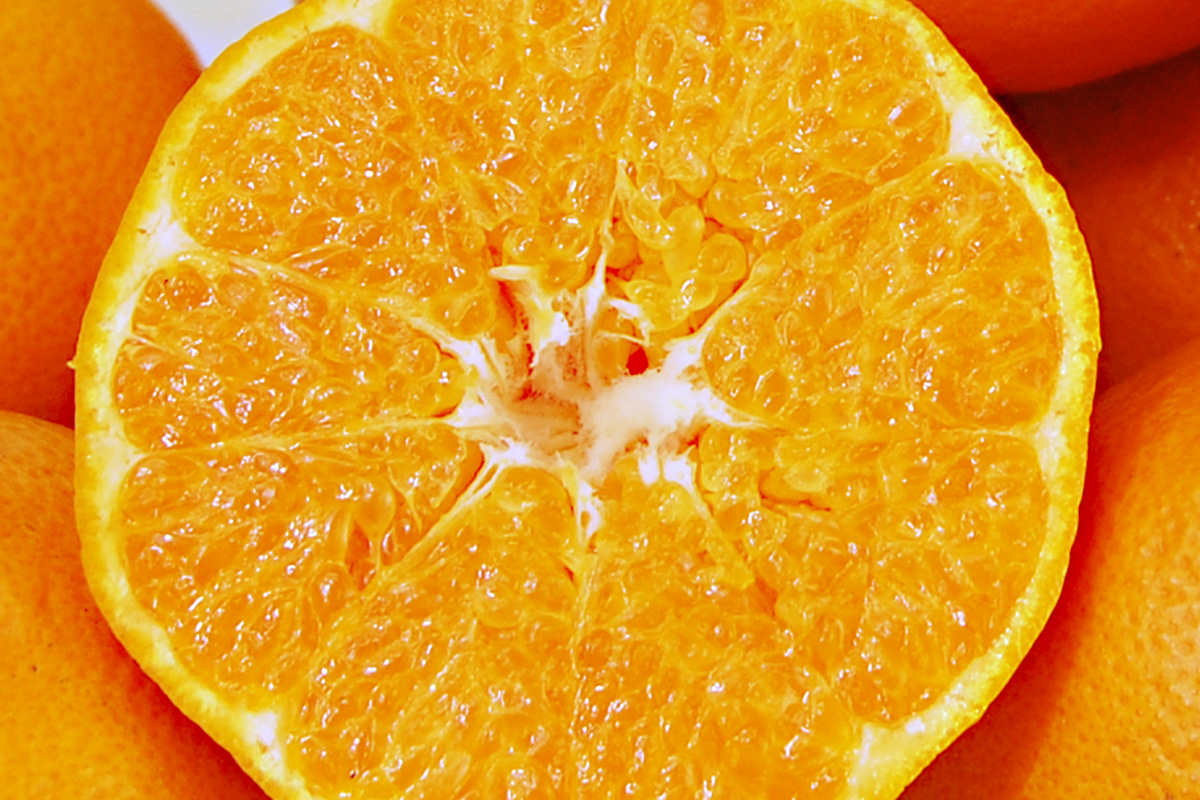 はるみはビタミンが豊富で、肌荒れや風邪予防に効果的です。また果肉の袋(じょうのう)には便秘改善の作用があるペクチンも多く含まれています。さらに袋や白いスジには、フラボノイドの一種「ヘスペリジン」が含まれていて、高血圧や動脈硬化を予防する効果があるといわれます。カロテノイドの一種である「βクリプトキサンチン」の含有量は、果物の中でトップクラス。βクリプトキサンチンは体内でビタミンとして働き、消化器官や視力を保持してくれます。また、βクリプトキサンチンは発がん抑制作用や老化防止にも期待されています。