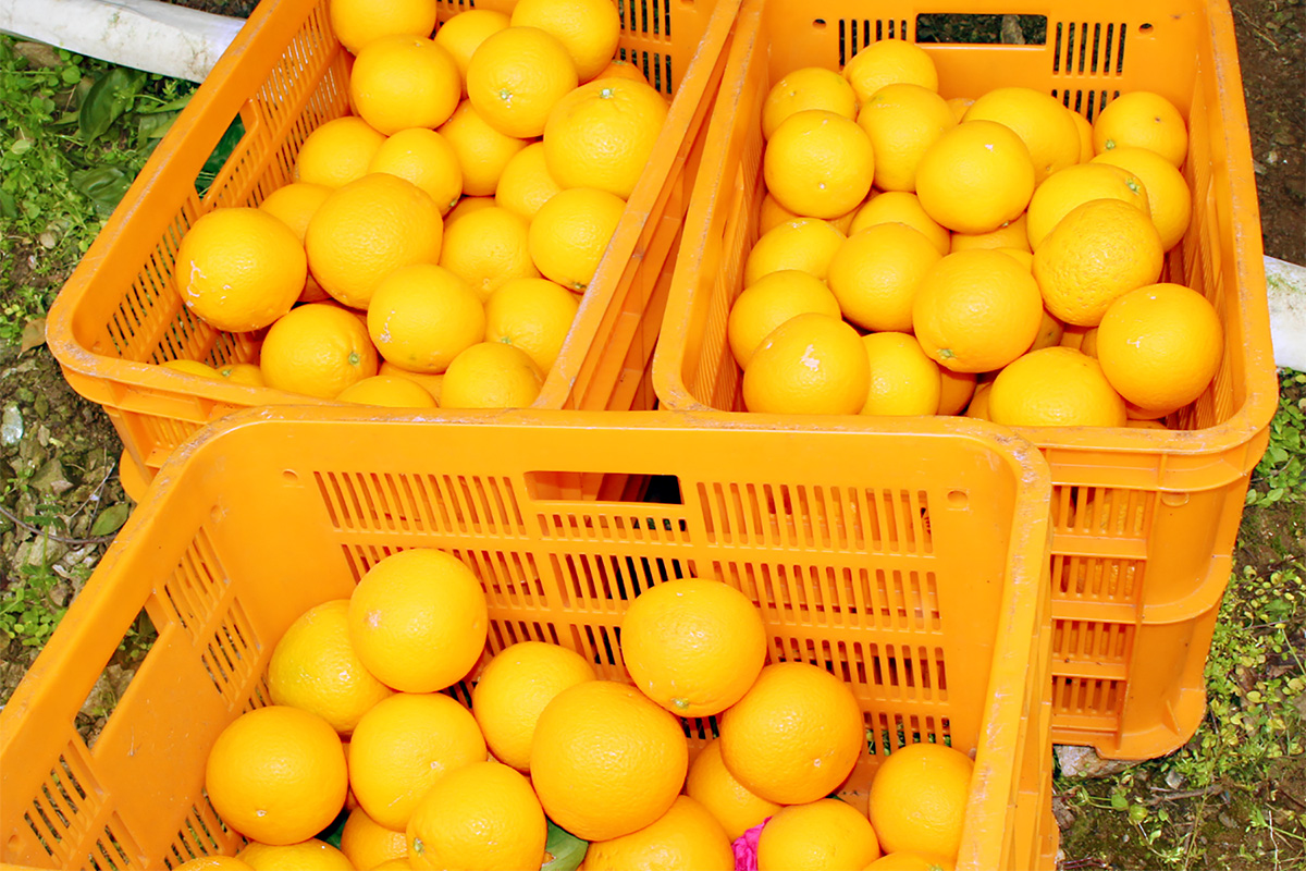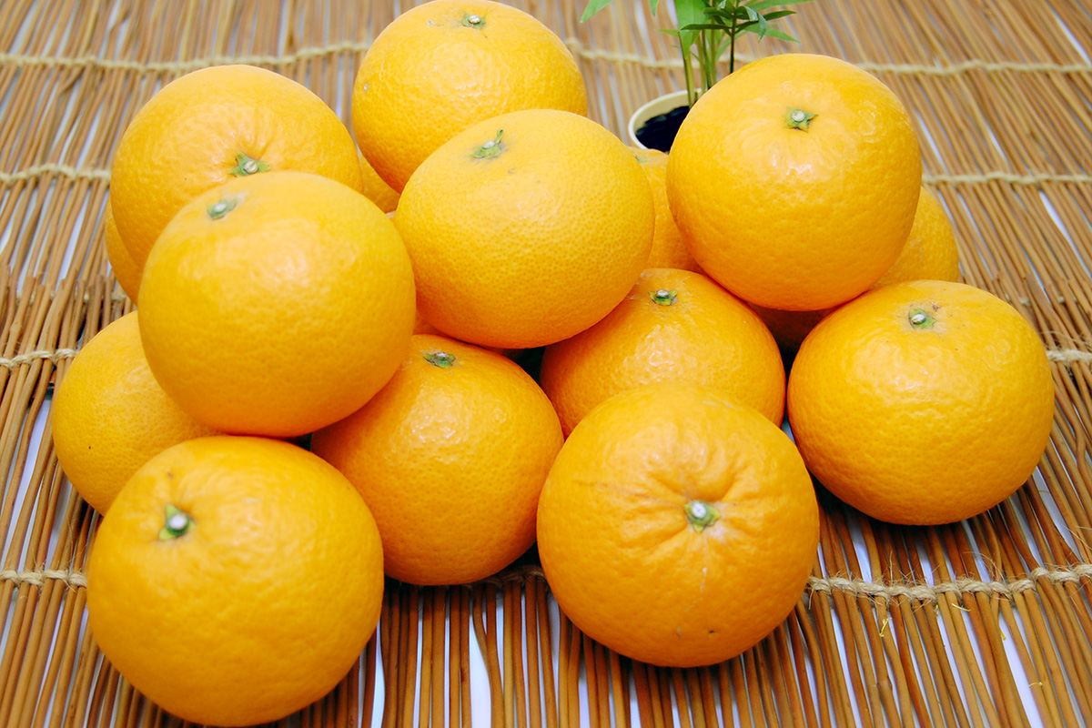 清見(きよみ)は、アメリカの「トロビタオレンジ」と、日本を代表する柑橘、「温州みかん」の交配により誕生した国産初のタンゴール品種(ミカン類とオレンジの雑種の総称)です。1979年(昭和54年)、静岡県の「清見潟」(きよみがた)から命名されました。果実はみかんより一回り大きく、扁球形で 200~250g前後、果皮は黄橙色でオレンジによく似ています。収穫時期は3月中下旬で、 3月中旬~5月にわたり出荷されます。