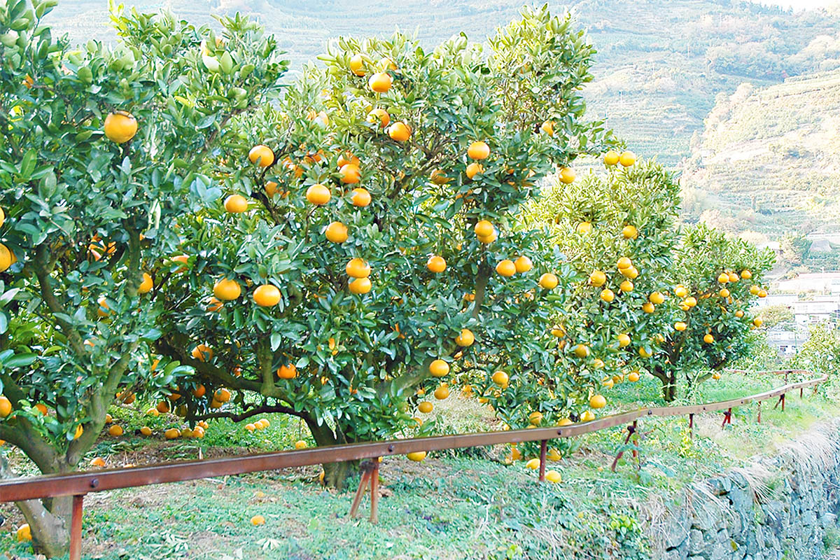 愛媛県は日本一の柑橘生産地です。なかでも西宇和地区で栽培される清見(きよみ)は、味・品質共に最高級のブランドです。だいすけ果樹園から出荷する生産地は、愛媛県の西南部に位置し、九州に突出た、40㎞の長さを有する日本一の佐田岬半島とその基部の八幡浜市・伊方町・西予市三瓶町の2市1町からなります。宇和海と瀬戸内海に囲まれた海岸部は典型的なリアス式海岸が続きます。地形は起状の多い傾斜地が連なり、平野部は極めて少ないです。土質は結晶片岩を母岩とする壌土・砂壌土が大部分を占めるほか、一部に秩父古成層・紋岩・石灰岩の層も見られます。日照量が多く、自然条件に恵まれ、清見(きよみ)栽培に適した環境となっています。