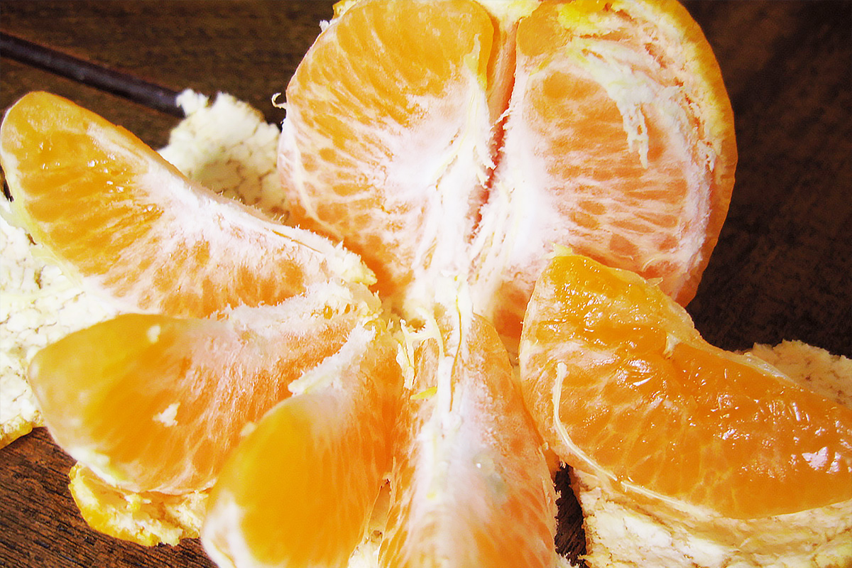 ポンカンはみかんとよく似ていますが、外皮の感じは少しポコポコしています。中の実との間に隙間が出来ていて、とっても剥き易くて食べやすい柑橘です。みかんほど果汁はありませんが、もっちりした果肉で、凝縮された濃厚な甘味が特徴です。中の小袋はみかんより厚めで種がありますが、後味スッキリの昔から人気のある伝統柑橘です。